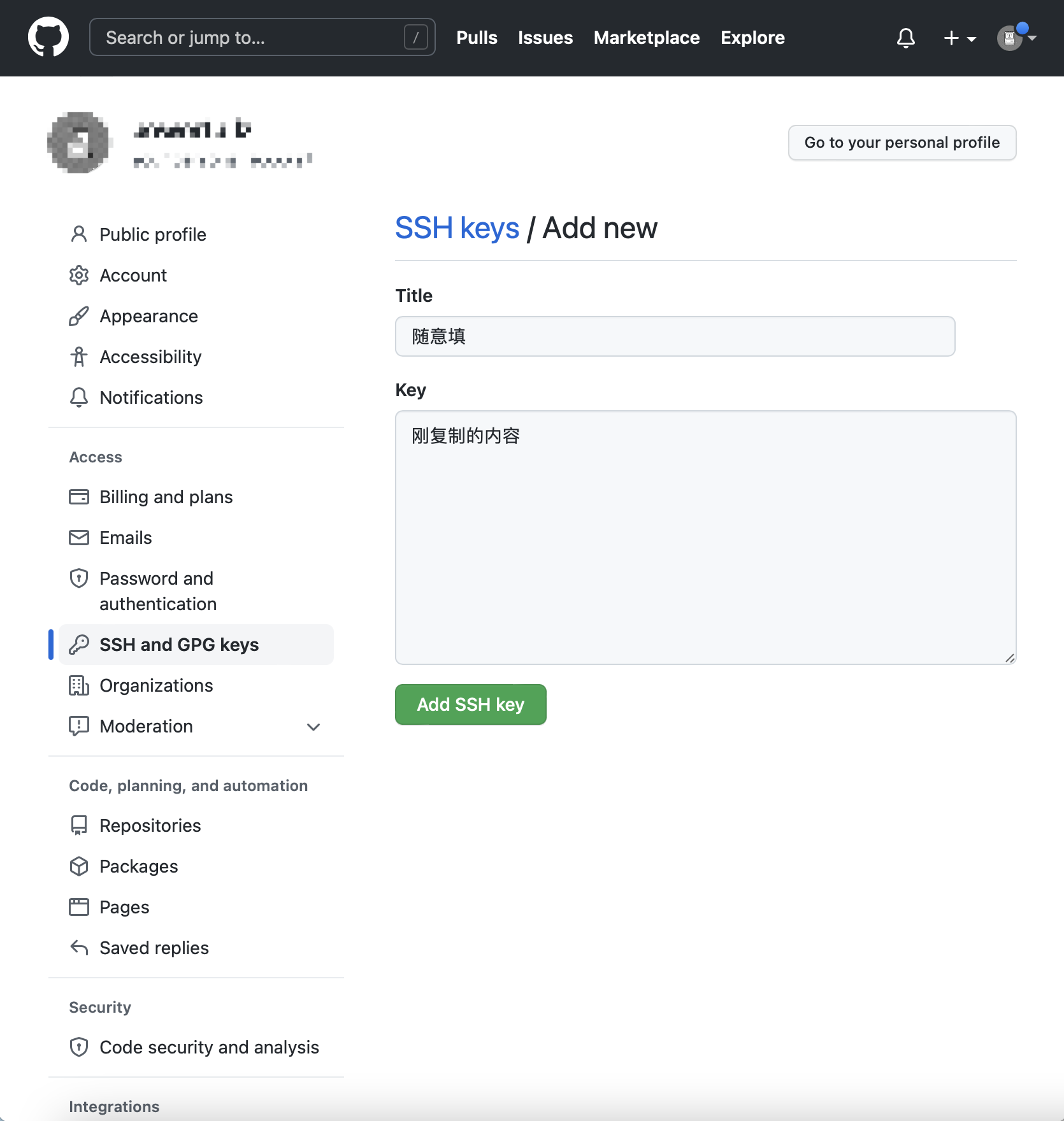 打开GitHub_Settings_keys 页面,新建New SSH Key,Title随意填,Key就把刚才复制的内容全都粘贴上去。然后点Add SSH Key即可。