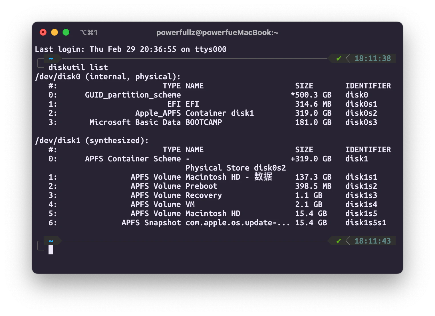 首先重启进入 Mac OS,打开终端,diskutil list列出所有的磁盘: