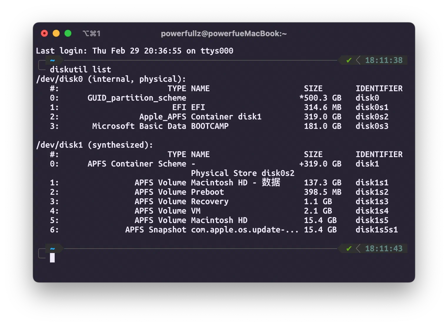 首先重啓進入 Mac OS,開啓終端,diskutil list列出所有的磁碟: